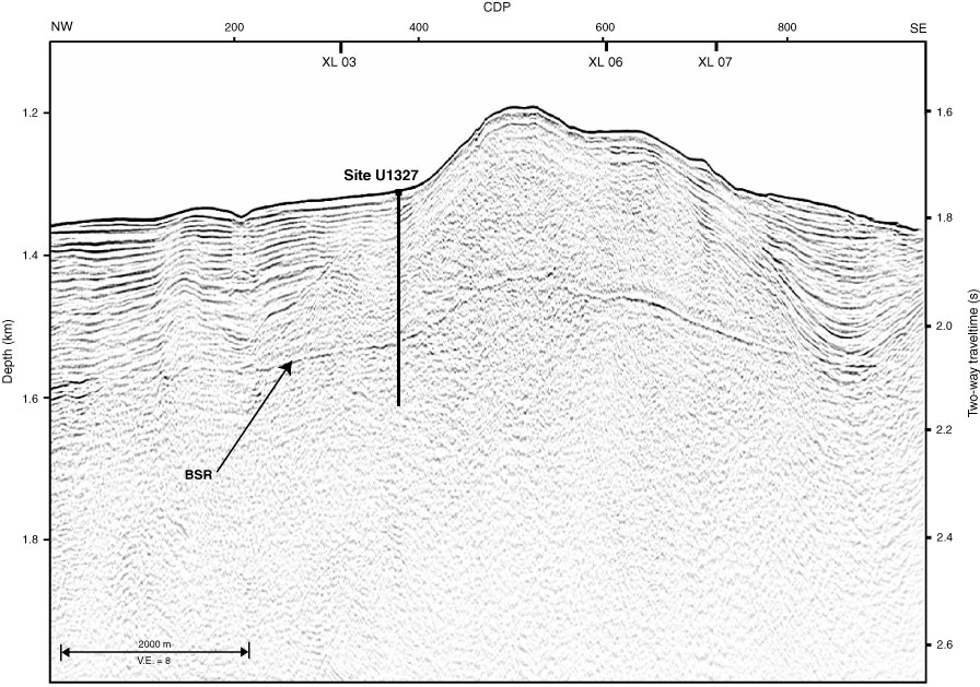 Figure F6. Seismic section from 1999 3-D multichannel seismic (MCS) Inline 38 over Site U1327. A bottom-simulating reflector (BSR) is clearly identifiable where it falls within the accreted sediments. In the deeper slope basins the BSR merges with regular reflectivity and becomes indiscernible. The reflection strength is reduced compared to what was observed in MCS Line 89-08 as attributed to the frequency-dependent behavior of the BSR (Chapman et al., 2002). CDP = common depth point, V.E. = vertical exaggeration.