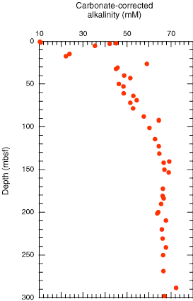 Figure F28. Concentration vs. depth profile of alkalinity values corrected for carbonate formation using calcium and magnesium data as proxies for the amount to dissolved inorganic carbon consumed by carbonate diagenesis.