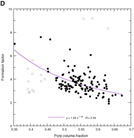 Figure F44 (continued). D. Formation factor vs. MAD porosity. A best-fit solution to Archie's equation gives Archie's parameters as m = 1.36 and a = 1.58. Solid circles = measurements included in the best-fit solution, open circles = sands, squares = outliers excluded from the analysis.