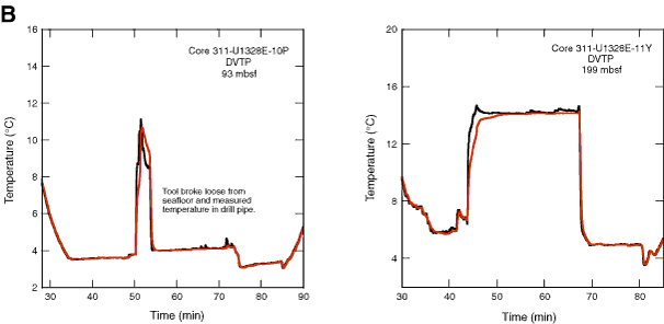 Figure F45 (continued). B. Davis-Villinger Temperature Probe (DVTP) temperature measurements from Site U1328. Both the upper (red) and lower (black) thermistors are shown.