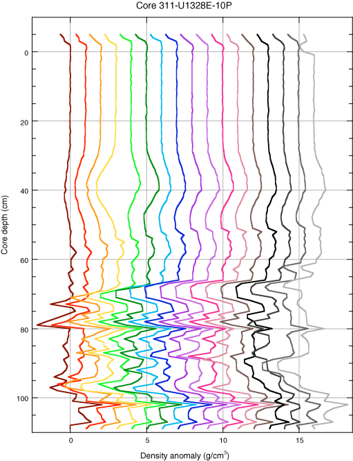 Figure F55. Repeated gamma ray density scans taken during the degassing of Core 311-U1328E-10P showing movement of sediment and gas out of the bottom of the inner core barrel. The data are plotted as differential density profiles (i.e., as profiles from which the initial gamma ray density scan has been subtracted). Each successive profile is offset by 1 g/cm3. Top of sediment is at ~63 cm core depth and rises during the experiment. Excursions in the graphs between 30 and 50 cm core depth are an artifact created by the interaction between the PCS and the vertical multisensor core logger.