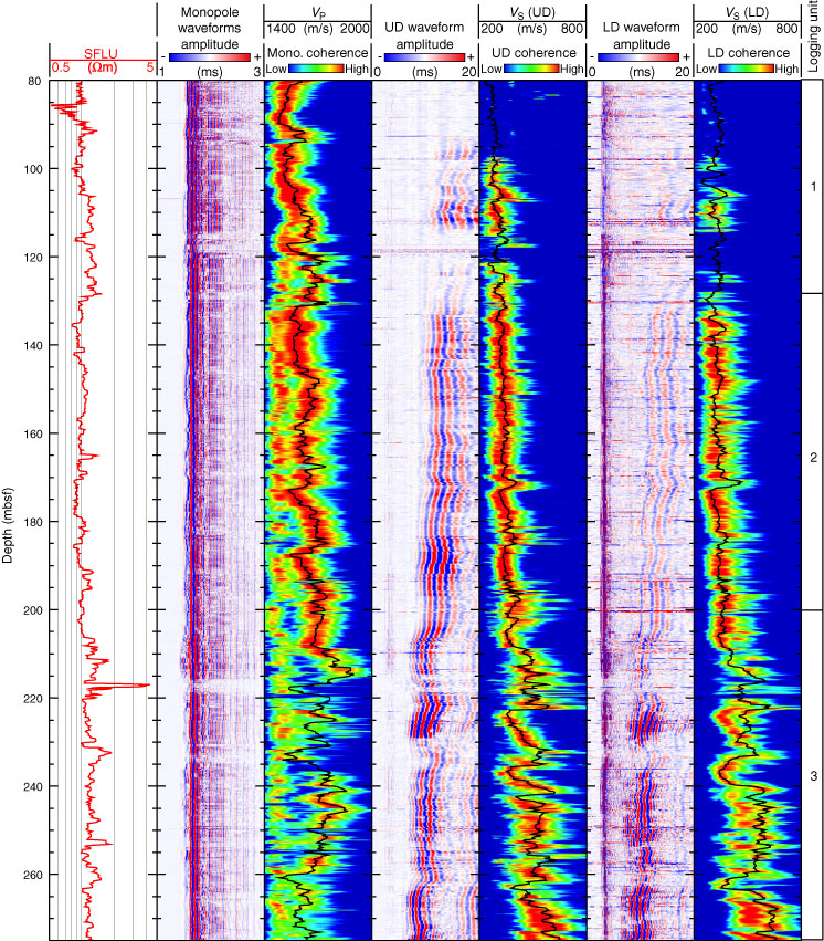 Figure F59. Sonic waveform data, P-wave velocity, and S-wave velocity obtained with the wireline Dipole Sonic Imager tool in Hole U1328C. SFLU = spherically focused resistivity, VP = P-wave velocity, Mono. = monopole, UD = upper dipole, VS = S-wave velocity, LD = lower dipole.