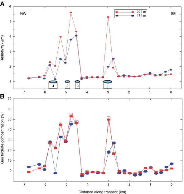 Figure F9. Profile of (A) electrical resistivity and (B) inferred gas hydrate concentration along a profile across the cold vent field (from Schwalenberg et al., 2005). Blank zones are denoted by the numbered ovals.
