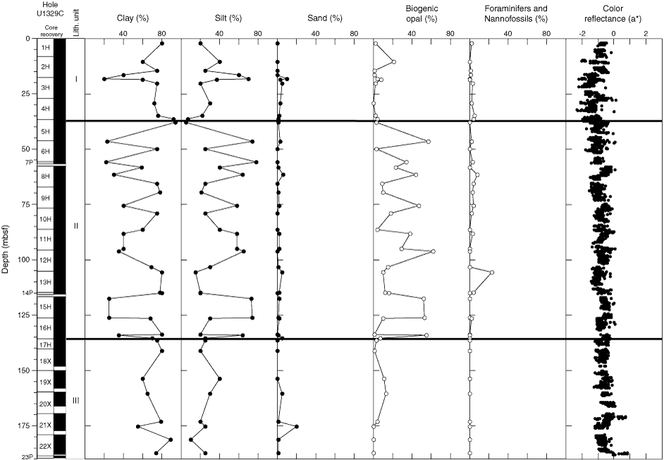 Figure F7. Lithostratigraphic summary for Hole U1329C showing the percentage of clay, silt, sand, biogenic opal (diatoms, radiolarians, siliceous spicules, and silicoflagellates), foraminifers, nannofossils, and archive multisensor track color reflectance (a*) in the major lithology.
