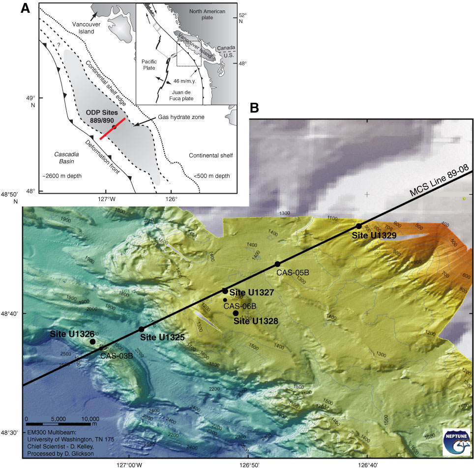 Figure F1. A. Plate tectonic setting of the Cascadia margin with general location of the drilling transect near previous Ocean Drilling Program (ODP) Sites 889/890. Gray shaded area = bottom-simulating reflector (~50% of the mid-continental slope). B. Multibeam bathymetry map along the transect across the accretionary prism with locations of transect Sites U1326–U1327 and U1329, cold vent Site U1328, and multichannel seismic (MCS) Line 89-08.