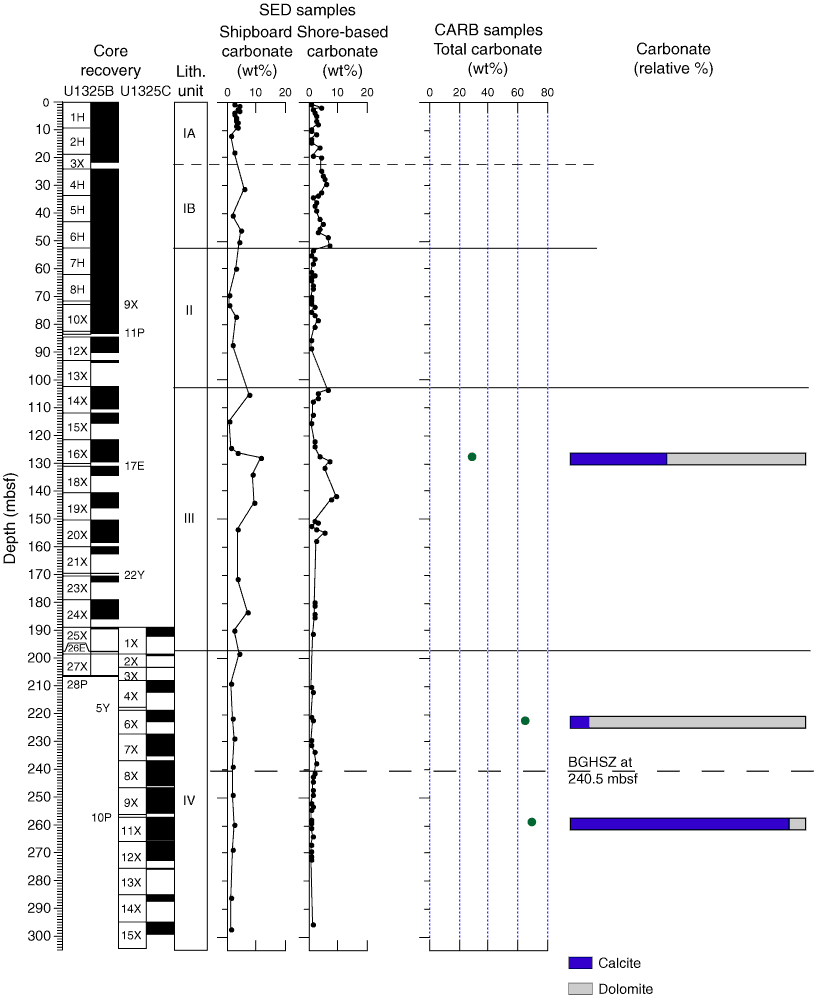Figure F4. Downhole variations of carbonates in sediment and authigenic carbonate samples, Site U1325. Lith. = lithologic, SED = standard sediment, CARB = semi-indurated to indurated authigenic carbonate sediment, BGHSZ = bottom gas hydrate stability zone.