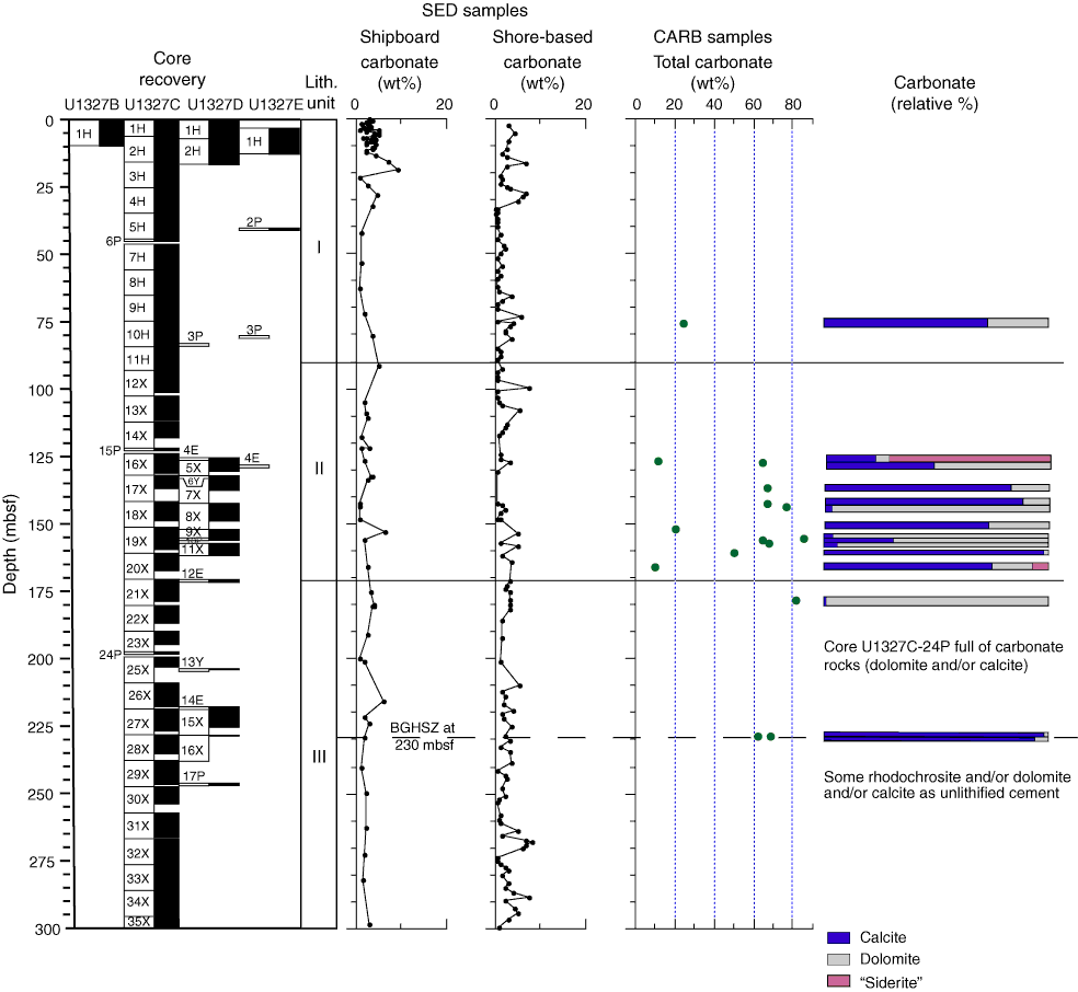 Figure F5. Downhole variations of carbonates in sediment and authigenic carbonate samples, Site U1327. Lith. = lithologic, SED = standard sediment, CARB = semi-indurated to indurated authigenic carbonate sediment, BGHSZ = bottom gas hydrate stability zone. XRD shipboard data were added for Cores 311-U1327C-24P, 29X, and 30X.