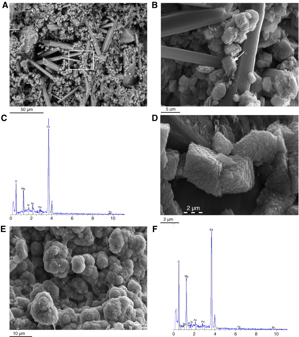 Figure F8. Scanning electron microscopy photographs of Site U1328 cold seep carbonate facies. A. General view (backscattered electron) showing the association of aragonite needles and small high-magnesium calcite (HMC) crystals (~13 mol% MgCO3) with knobbly surface (Sample 311-U1328B-6X-1, 0–20 cm). B. Secondary electron detail of A. C. Energy dispersive spectrometer (EDS) spectrum of HMC crystal (arrow in B). D. Small HMC crystals (~16 mol% MgCO3) with knobbly surface (Sample 311-U1328B-6X-1, 47-50 cm). E. Clusters of rounded dolomite grains with knobbly surface (Sample 311-U1328D-2X-2, 30-31 cm). F. EDS spectrum for sample in E.