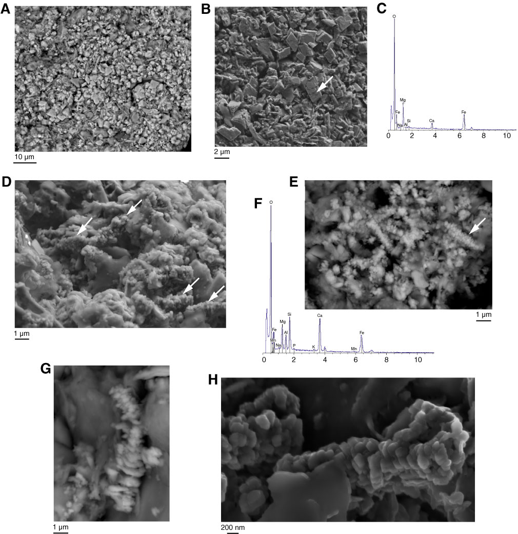 Figure F9. Scanning electron microscopy photographs of siderite and rhodochrosite authigenic facies. A. General view (backscattered electron [BSE]) of rhombohedra (1–4 μm) (Sample 311-U1329C-21X-3, 129–131 cm). B. Secondary electron (SE) detail view of A. C. Energy dispersive spectrometer (EDS) spectrum corresponding to an intermediate phase between magnesite, siderite, and calcite (see Mg, Fe, and Ca in EDS spectra). Corresponding XRD diagram appears indicate siderite with all peaks translated toward higher values (e.g., d104 ≈ 2.809 Å instead of 2.796 Å). D. SE photograph showing carbonates corresponding to thin areas (<1 μm; arrows) scattered in the detrital matrix (Sample 311-U1326D-20X-3, 0–1 cm). E. Dispersed fragments of sample in D observed on a glass slide (BSE). F. EDS spectrum of sample in E with Ca, Fe, Mg, and some Mn in the carbonates. G. Higher magnification of E showing aligned bladelike particles. H. Higher magnification of E showing rhombic crystals.