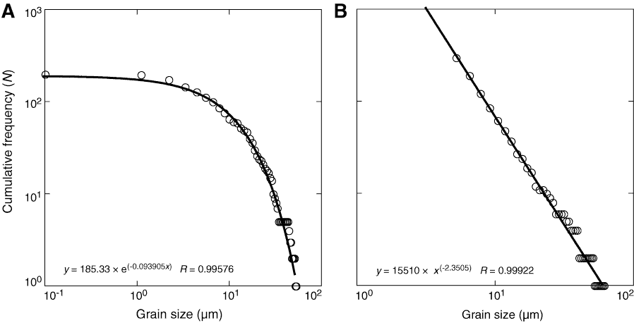 Figure F2. Examples of the fittings by (A) exponential function (Sample 311-U1329C-17H-2, 135–145 cm) and (B) power function (Sample 311-U1326C-3H-6, 75–85 cm).