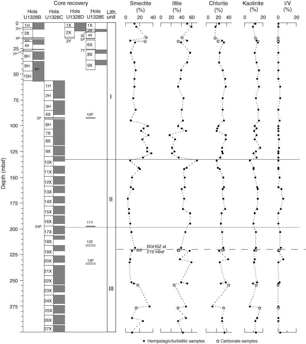 Figure F6. Downhole variations of clay minerals in sediment and authigenic carbonate samples, Site U1328. BGHSZ = bottom gas hydrate stability zone. I/V = illite/vermiculite.