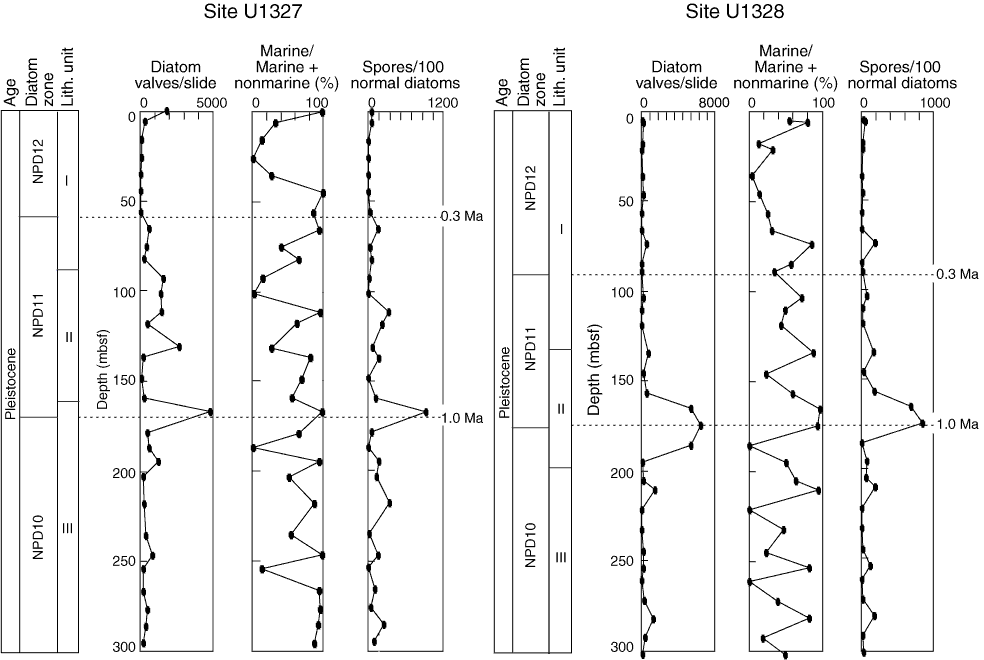 Figure F2. Diatom abundance, marine vs. nonmarine diatoms, and Chaetoceros resting spore abundance based on shipboard analysis data (see the "Expedition 311 summary" chapter), Sites U1327 and U1328. NPD = North Pacific Diatom Zone.