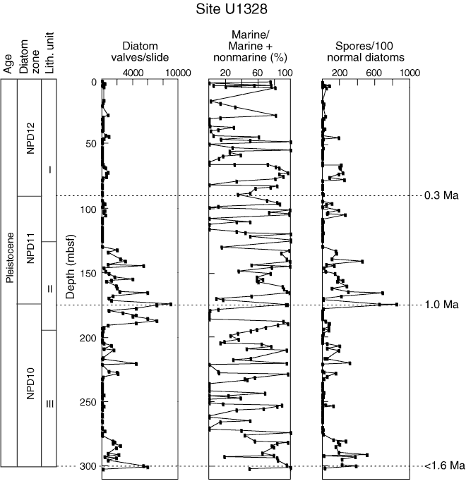 Figure F3. Diatom abundance, marine vs. nonmarine diatoms, and Chaetoceros resting spore abundance based on shore-based analysis of higher resolution sampling, Site U1328. NPD = North Pacific Diatom Zone.