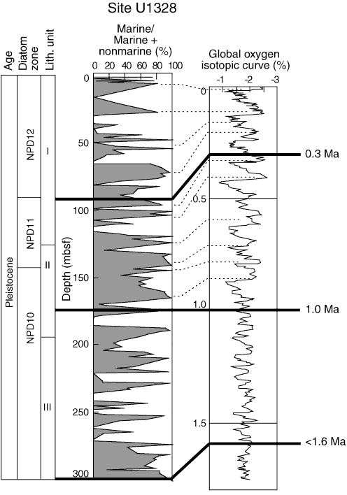 Figure F4. Comparison of marine vs. nonmarine diatom ratio at Site U1328 and global oxygen isotope curve by de Garidel-Thoron et al. (2005). NPD = North Pacific Diatom Zone.