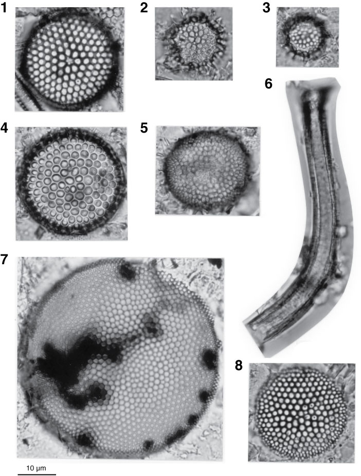Plate P4. Light microscope images of marine diatoms, Holes U1325B, U1327C, and U1329C. 1. Thalassiosira antiqua (Grunow) Cleve-Euler (Sample 311-U1329C-20X-1, 10–20 cm). 2. Thalassiosira jouseae Akiba (Sample 311-U1329C-5H-CC). 3. T. jouseae Akiba (Sample 311-U1329C-16H-CC). 4. Stephanopyxis dimorpha Schrader (Sample 311-U1329C-16H-CC). 5. Actinocyclus oculatus Jousé (Sample 311-U1327C-32X-CC). 6. Proboscia curvirostris (Jousé) Jordan and Priddle (Sample 311-U1325B-18X-CC). 7. Actinocyclus curvatulus Janisch (Sample 311-U1329C-5H-CC). 8. Thalassiosira oestrupii (Ostenfeld) Proshkina (Sample 311-U1325B-18X-CC). Note many small grains of probable organic matter observed inside the diatom, which are also seen in other specimens (Pl. P1, figs. 7, 15).