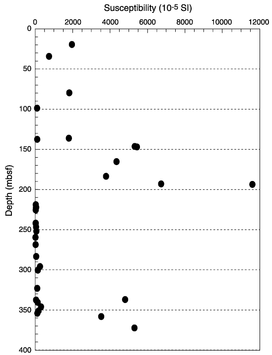 Figure F126. Magnetic susceptibility vs. depth of 40 minicore samples. Holes 1188A and 1188F are combined into one profile.