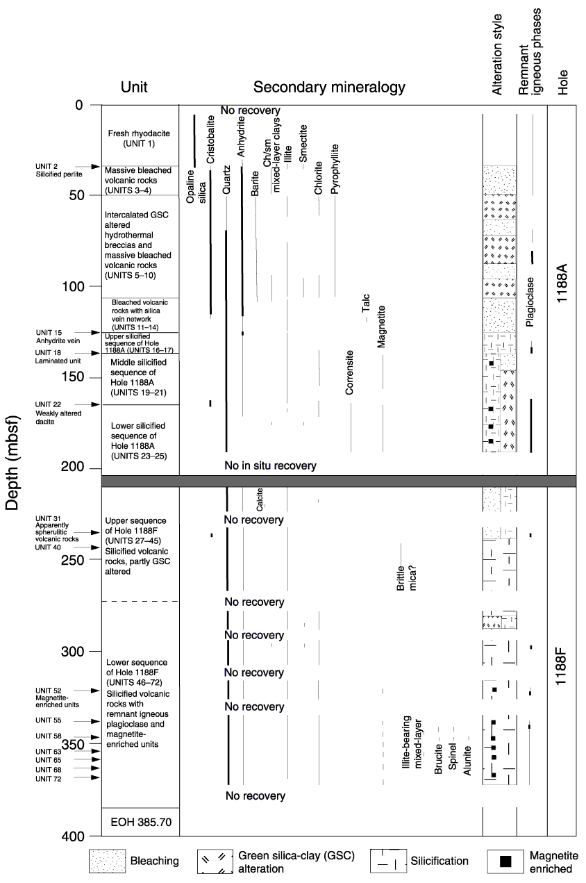 Figure F35. Summary of lithostratigraphic units, alteration style, and distribution of major (heavy lines) and minor to trace (light lines) alteration phases at Site 1188. Shaded intervals = cores where there was no recovery or no in situ recovery. Intervals where remnant igneous plagioclase was detected by X-ray diffraction (XRD) are also indicated on the right hand side. Pyrite is present in all samples analyzed and is not included in the plot. Note the variation in silica species with depth. Clay and phyllosilicate phases are indicated where detected in XRD analyses; no indication of their abundance relative to other phases is implied. It is anticipated that detailed postcruise investigation will extend the distribution ranges for some of these minerals. The terms major, minor, and trace as used here apply to XRD peaks and do not imply quantitative abundances (see "Hydrothermal Alteration" in the "Explanatory Notes" chapter). As the data are still under evaluation, mineral distribution indicated by portable infrared mineral analyzer (PIMA) is not included in the plot. EOH = end of hole. Ch/Sm = chlorite/smectite.