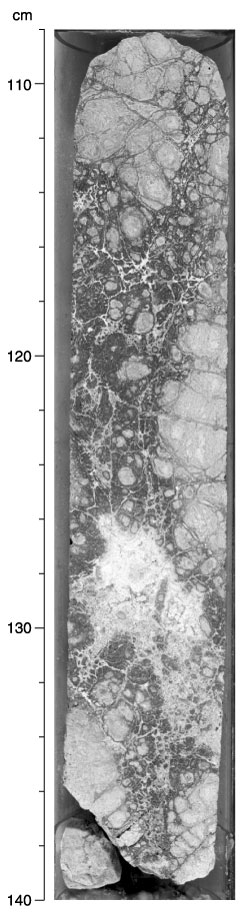 Figure F41. GSC altered rock (Unit 6) with a remnant perlitic texture with superimposed dark alteration halos composed of silica-anhydrite-dusty pyrite ± clay and late anhydrite-(silica-pyrite) stockwork veining. The large white patch near the center of the photographed piece is late bleaching surrounding a late irregular anhydrite-pyrite vein (interval 193-1188A-8R-1, 108-140 cm).