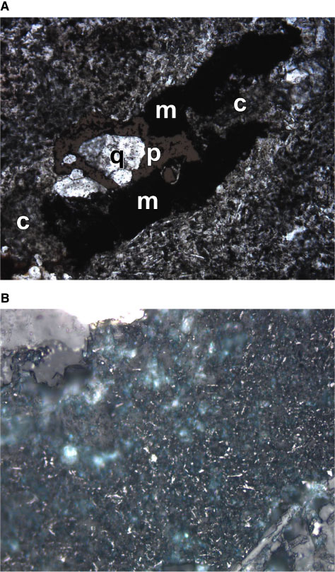 Figure F63. A. Combined plane-polarized transmitted and reflected light photomicrograph of a "magnetite" (m)-chlorite (c)-quartz (q)-pyrite (p) filled vesicle. Width of view = 1.4 mm. B. High-magnification reflected light image of the opaque portion (m) of the amygdule in (A). It consists of fine, spongy remnant magnetite in a matrix of clay (white internal reflections) and dark opaque material. Width of view = 0.275 mm (interval 193-1188F-40Z-1, 3-5 cm; Unit 65). Photomicrograph ID# 1188F_94 and 1188F_95; thin section 106).