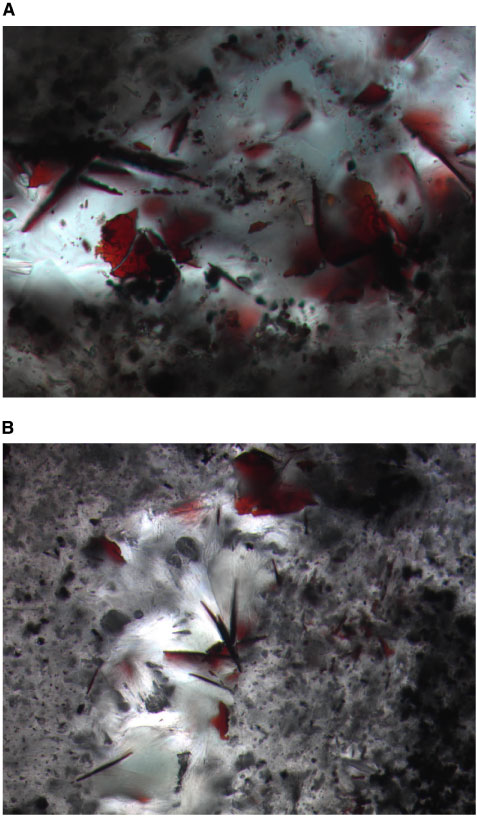 Figure F66. Photomicrograph of hematite in Unit 58. A. Bladed crystals of hematite in quartz, associated with bladed magnetite (in plane-polarized light [oil immersion]; width of view = 0.14 mm). B. Hematite as vesicle fill, with colorless alunite or brucite and pale green chlorite (interval 193-1188F-37Z-2, 31-33 cm, in plane-polarized light; width of view = 0.275 mm. Photomicrograph ID#s 1188F_75 and 1188F_89; thin section 101).