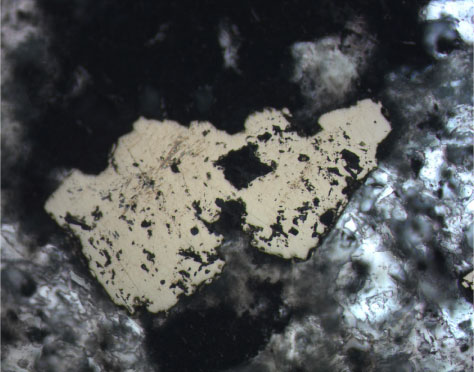 Figure F67. Combined plane-polarized transmitted and reflected light photomicrograph showing pyrite overgrowing a dark magnetite-bearing aggregate. Note the fine lamellae of magnetite in the opaque area of the slide and the magnetite inclusions in pyrite (interval 193-1188F-40Z-1, 3-5 cm; Unit 65; width of view = 0.7 mm. Photomicrograph ID# 1188F_96; thin section 106).