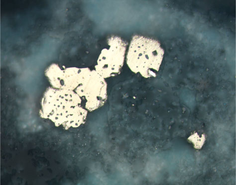Figure F91. Tiny magnetite (gray) inclusions in pyrite (white). Groundmass contains magnetite grains within quartz that are the same size and shape as the magnetite inclusions in the pyrite (Sample 193-1188F-13Z-1 [Piece 3B, 47-50 cm] in reflected light; width of view = 0.275 mm. Photomicrograph ID# 1188F_62; thin section 77).