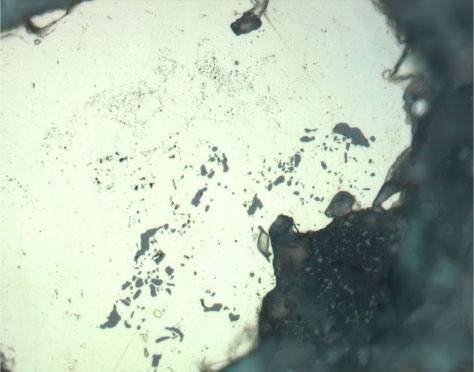 Figure F92. Magnetite (gray) inclusions in pyrite (white) having the same morphology as those in the neighboring quartz (black) in the groundmass. Magnetite inclusions in the center of the pyrite grain are smaller than those near the edge suggesting that the former have been partially replaced (Sample 193-1188F-25Z-1 [Piece 4, 24-26 cm] in reflected light; width of view = 0.275 mm. Photomicrograph 1188F_71).